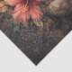 The composition uses an aged background with dripping paint effects, rich reds, warm neutrals, and antique textures for a dramatic gothic aesthetic. The striped stockings and red heels create a bold contrast against the skull and floral arrangement.