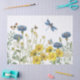 Ilustrações de flor selvagem vindas num fundo floral pálido. As flores incluem chicória, lavanda, camomila, renda da Rainha Anne, amanteparo, erva-prada e girassol numa mistura de amarelos, brancos e azuis. Borboletas, libélulas e abelhas estão ocupadas polinizando o campo. Pode ser utilizado como um presente para um jardineiro ou para um projeto de dissociação ou transferência de mobiliário.