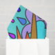 Orange, pink and yellow sunburst above a blue and lavender cloudy sky. Rainbow below a blue cloud with colorful raindrops.