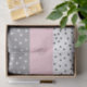 Design geométrico feminino em cinzento e cor-de-rosa pastel.
