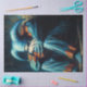 O papel tecidular mostra a pintura de um éster desapontado sentado em uma cadeira. A cara triste está vestindo uma roupa de jester azul e laranja, e seus joelhos são puxados para o peito, a cabeça se curvou. A trabalho de arte invoca a tristeza, a depressão, a melancolia; a arte irônica que apresenta um tolo no desespero. Luz escura e temperada acentua a atmosfera sombria.