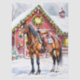 Bonito papel de tecidos de Natal, com a ilustração de um cavalo marrom parado em frente a um belo celeiro vermelho decorado em luzes de Natal e uma coroa festiva num dia de inverno nevado.