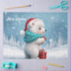 Um pequeno ursinho bonitinho com chapéu de Natal e presente. O urso tem pelo liso e olhos redondos grandes que brilham com curiosidade e alegria. Suas pequenas patas estão amorosamente envoltas ao redor do presente como se ele tivesse acabado de descobrir.