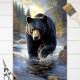 Esta ilustração detalhada apresenta um urso preto parado em um rio, seu quadro forte cercado por água fluente e elementos naturais. O contraste da silhueta escura do urso com o gentil rio evoca a beleza crua e a tranquilidade da natureza selvagem.