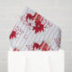 O fundo apresenta cinzas e listras brancas, com uma poinsettia vermelha e branca ao lado de uma vela vermelha, com gotas brancas de brilho.