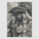 Three victorian girls in their fancy dresses and hats huddle together under an umbrella during a spring rain. In black and white.
