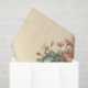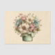 Tissue paper with a cute image. Blue. pink and cream colored flowers with green leaves. Set inside a green flower pot with a green plaid cloth hanging over the side.