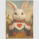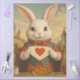 Fall in love with this charming and unique take on the White Rabbit from Alice in Wonderland! This delightful illustration portrays a cute, anthropomorphic white rabbit seated at a rustic table, holding a heart-adorned invitation or card. Dressed in a whimsical red and green outfit, he's ready for a tea party in an enchanting landscape dotted with fairytale castles, colorful banners, and blooming flowers. Teacups and a cake complete this sweet and imaginative scene, perfect for fans of Alice in Wonderland and anyone who adores whimsical, heart-filled art.