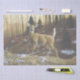 Uma pomba branca está assustada pela sua presença. Folhas de queda e uma leve poeira de neve indicam que é no final do outono na floresta. Trabalho de arte realista criada de uma pintura original de óleo pelo artista equino e da fauna selvagem Crista S. Forest.