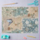 Feita a partir de 3 pinturas de borboletas por Audrey Jeanne e 4 pinturas de arte originais e esboços de William Morris, incluindo uma bela ilustração floral de tulipas botânicas, folhagem de estilo de efêmera castanha e bronca, e vários padrões florais parcialmente pintados em preto, verde-azul-aqua e branco-macio. Várias variações nesta colagem estão disponíveis para uma grande superfície como curandeiros, armários, mesas e móveis decorativos semelhantes. Ideal para uma estética de design Cottagecore do estilo antigo. Estes foram projetados graficamente em uma complexa colagem por uma artista e designer internacionalmente licenciada, Audrey Jeanne Roberts, copyright.