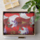 Um belo jornal de natal unicórnio, com magníficos unicórnios brancos com mansos roxos e grandes asas brancas. Eles têm chifres de ouro e poinsettia vermelha e santo de Natal debaixo deles. À volta deles estão as árvores de Natal e ouros. Todos parecendo muito festivos em um lindo e vívido fundo vermelho.
