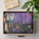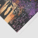 Bruxa com um vestido roxo e preto com cabelo laranja. Folhagem e flores a adoram com chapéu. Ela está em um jardim malvado.