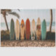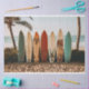 Desentupindo papel com imagem de pranchas alinhadas na praia com o oceano e palmeiras.