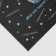 Este papel tecidular é mostrado com um impressão de estrelas comemorativo, parabéns de tamanho menor espalhados por toda parte em Cinzas Suaves em um fundo preto com felicitações Turquesa Azul maiores e impressão azul brilhante com seu título e ano personalizados. Preciso personalizar esse papel de tecido.