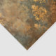 Este é um padrão decorativo ornamentado em tons de ouro, turquesa e ferrugem. O design apresenta um damasco intrincado, simétrico ou arabesco que se assemelha a folhas estilizadas de acanthus, pergaminhos e elementos florais dispostos em colunas verticais. Os padrões têm uma aparência afligida, meteorológica, com áreas desbotadas e vestidas, revelando turquesa e ferrugem por baixo da camada superior de ouro. Este efeito patina envelhecido dá ao design uma sensação antiga ou vintage.