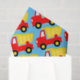 Papel colorido de aniversário de criança de presente de caminhão de depósito de brinquedos. Preenchimento personalizado para presentes e favoritos para festas para crianças. Entregas de festa de tendências e acessórios DIY para comemorações de chá de fraldas ou aniversário divertidos, etc. Cor de fundo personalizável atrás do padrão de lixão vermelho. Ilustração do veículo de construção para rapazes.