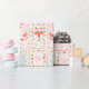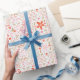 Papel de embrulho de presente de Natal Bonito e festivo. Cor vermelha, branca, rosa mint e pastel, brilhante e feliz. árvores de natal aves, corações, bagas, estrelas.