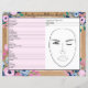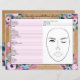 Este elegante e feminino gráfico de consulta de beleza facial é perfeito para qualquer empresa moderna; salões, lojas e vários negócios. Ele apresenta flores e folhas pintadas à mão em aquarela azul, rosa, verde, amarelo e preto em torno de uma borda dourada impressa falsa com uma caixa de texto rosa e branco e um desenho ilustrado do rosto de uma mulher para demonstrar a aparência do seu cliente sobre um fundo de papel kraft marrom. É country, fofo, bonito e único. No verso há um espaço para o seu logotipo e informações da empresa. ***Contate o designer se você precisar de alguma alteração na folha.***