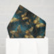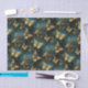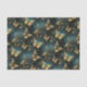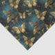Um papel de tecido elegante com padrão de borboletas em matizes de ouro reluzentes e azuis brilhantes.