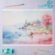 Cores de água costeira em pasta mole, com vista a uma costa natural e a embarcações de navegação. Este design pode ser utilizado como embalagem para brindes, papel para tecidos, guardanapos, impressões ou vários têxteis.