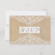 Este convite de casamento muito bonito está no estilo de tela vintage e desgastada. No topo da "tela" há um atraente e delicado padrão de renda floral em cor marfim ou creme claro. No meio, há um painel feito para parecer um pedaço de papel pergaminho com bordas rasgadas para destacar o texto: RSVP. O verso do cartão também tem o design de "tela" e "papel". O sentimento geral deste cartão de resposta de RSVP é ao mesmo tempo elegante e rústico. Outras versões e itens coordenados estão disponíveis. Por favor, use os links "enviar mensagem" ou "contato" se precisar de ajuda para personalizar qualquer um de nossos produtos.