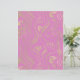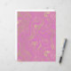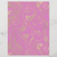 Possui um design dourado abstrato marmoreado em um fundo rosa.