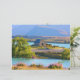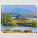 Imagem fotográfica cêntrica mostra a Igreja do Bom Pastor e a bela paisagem ao redor, no lago Tekapo, Nova Zelândia. Imagem na frente e no verso do papel de raspagem