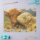 Vacas em terras altas num campo de girassóis com uma vista montanhosa ao fundo. De uma fotografia original da artista Jennifer Carroll