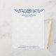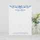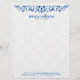 Elegant blue vintage floral swirl design over a white plush damask background.