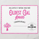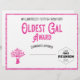 Tenha algum divertimento e distribua este prêmio o mais velho do galão em sua cerimónia de prêmios da reunião de família. O rosa, preto e branco com olhar afligido inclui uma árvore genealógica com um coração e um logotipo da reunião de família. Escreva no nome dos vencedores do prêmio, adicione seu nome de família, ano de evento e lugar do evento. Lembrança agradável da lembrança da reunião de família.