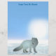 Branco em branco. Uma pintura digital de uma Raposa Árctica (Vulpes lagopus) no gelo polar. O sol pendura baixo no brilhante céu ártico azul. Não olhe para o sol pois pode danificar os seus olhos. Personalize adicionando seu próprio texto. A Raposa Árctica é confortável a frio profundo; não começa a arrepiar-se até que as temperaturas caiam para cerca de -70 °C devido à sua pele densa e multicamadas. Outras adaptações a um clima rígido incluem pelo nas solas dos pés, orelhas curtas e um pequeno focinho. As raposas árcticas vivem em tocas, numa nevasca que podem enrolar na neve para criar abrigo. O casaco da raposa do Ártico, por vezes cinzas azuis, é uma camuflagem de inverno muito eficaz. As matizes naturais permitem que o animal se misture no ambiente. Durante a curta estação quente, sua casaco muda para marrom ou cinza, novamente atuando como camuflagem em rochas e plantas tundra. Durante o inverno, quando as presas são escassas, as raposas seguem as ursinhas polares caçadoras que se alimentam de restos. Durante o verão comem roedores, aves, ovos e até peixes. Também se alimentarão de bagas e algas. As raposas árcticas têm uma audição extremamente entusiasmada, auxiliadas pelas suas orelhas largas e viradas para a frente, que lhes permitem localizar a posição exata das suas presas sob a neve. Se ouve algo se movendo sob a neve ele salta para o ar e solta, socando a neve para pegar sua presa. O alcance das raposas do Ártico é circunpolar; elas podem ser encontradas em todo o extremo norte. O único mamífero terrestre nativo da Islândia, chegou caminhando sobre o gelo no mar no final da última era glacial.