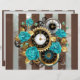 Relógio antigo e patenteado, adornado com joias, mãos de ouro e algarismos latinos com rosa de turquesa sobre fundo castanho e listrado. Estilo Steampunk.
