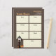 Projetado por Farida Greenfield. Uma ilustração de moda de uma senhora vestindo um lindo vestido preto elegante e elegante, segurando uma vassoura-de-bruxa decorada com fitas pretas com abóboras no primeiro plano. design perfeito com tema de Halloween. O design é para o planejador semanal dividido em sete seções diárias. Ele tem um fundo castanho claro e pode ser personalizável com seus próprios textos.