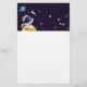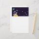 Papel de papelaria com fundo azul escuro com estrelas amarelas espalhadas ao redor. Camadas sobre o topo é uma ilustração de um homem espacial vestindo um traje astronauta branco flutuando sobre a lua. Ao longe está um planeta com anéis e um foguete voando para o céu procurando novos mundos para explorar.