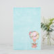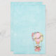 Papel de papelaria com um adorável design com ilustração de aquarela. Um balão de ar quente decorado com flores bonito, vermelhas e rosa. Um pequeno ursinho branco giro sentado na cesta. Fundo azul claro.
