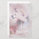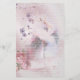Ballerina dançando a um pé vestindo uma rosa claro. Pequenas flores roxas e leves em diferentes tamanhos espalham-se atrás da bailarina. Pia rosa no canto inferior esquerdo. Fundo de cor d'água roxa e cor d'água roxa e papel branco revestido e papel de escrevendo.