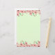 Um papel de carta verde com as flores cor-de-rosa pequenas bonitas ao longo dos lados da parte superior e da parte inferior do teste padrão estacionário. As flores têm a obscuridade - os centros vermelhos e o verde pequeno saem em suas hastes.
