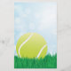 ilustração da bola de tênis na grama com luz do sol e do alargamento no fundo.