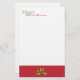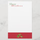 Bonito papelaria de Natal feita em branco, com uma banda vermelha em bolinhas vermelha, na parte inferior, com gráficos de um som de decoração sagrada no meio. Feliz Natal em texto vermelho e verde, no topo da papelaria, é perfeitamente personalizável para ler o que você quer. Personalize para adicionar texto a este papel de carta de feriado de na moda ou escreva manualmente a carta de Natal.