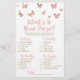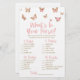 Este é um tema de borboleta rosa "What's In Your Purse Chá de panela Game". O que há na sua bolsa? - Os convidados terão pontos para cada item que tiverem na bolsa. Quem ganha mais pontos, ganha! borboletas rosa, rosa e marrom, jogos divertidos, atividades de chá de casamento