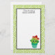Papel de carta com seu nome personalizado. Uma bela ilustração de um cacto verde sentado num pote de flores. Grandes olhos kawaii e vestindo um sombrero vermelho. O plano de fundo é um padrão com espirais de verde limão com um quadro branco sobre o topo para o dentro de escrevendo.