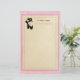Uma ilustração da silhueta de um par de calçados balés pretos em uma pose pontiaguda. Uma textura de pergaminho retangular no centro para escrever. O fundo é cor-de-rosa com pequenas bolinhas. Personalize com seu próprio nome.