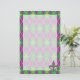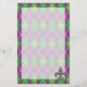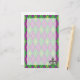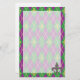 Um padrão harlequin de verde e roxo se transforma em um argilo lúdico com uma camada de contornos de diamante de ouro e flur de lis, criando um padrão divertido e colorido perfeito para qualquer nova orleans influenciou a celebração do Mardi Gras. Uma pulseira com padrão fica no canto inferior da papelaria para criar um toque bonito.