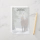 Papel de papelaria com fotografia de um cavalo marrom com um mane branco esfregado longo. Em pé em uma floresta com flocos de neve caindo por toda parte.