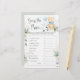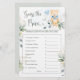 Este design apresenta um urso de pelúcia amigável com arco azul e balão cardíaco. Ele está cercado por folhagem verde. Adivinha o jogo do Chá de fraldas de preço.