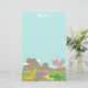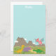 Uns artigos de papelaria bonitos e coloridos do dinossauro para crianças! Vêm com dinossauros dos desenhos animados, um Brachiosaurus amarelo, um Triceratops roxo, um Stegosaurus verde e um Pterodactylus cor-de-rosa. Fundo das montanhas e das nuvens. Este design atrativo é grande para os miúdos que amam temas jurássicos, pré-históricos ou do dinossauro. O texto lê a "nota".