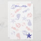 Uma combinação divertida de cavalo marinho, veleiros, baleias, âncoras e estrelas. Os objetos de fundo são vermelhos e azuis.