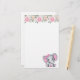 Papel de papelaria com uma ilustração de aquarela de elefante rosa e giro. Ela tem orelhas bonitinhas, cor-de-rosa e bolinhas branca e arco bonito de fita rosa sobre a cabeça. O topo é decorado com um belo buquê de rosa.