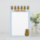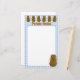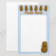 Linda batata marrom de desenho animado com um rosto feliz adorável fica no canto inferior direito e na parte superior do papel há uma linha das mesmas batatas engraçadas. O fundo é um padrão clássico de xadrez azul e branco, gingham. Um modelo que lê Notas de Batata em letras laranjas abaixo da linha de batatas na parte superior da página é um modelo que pode ser usado como está ou alterado para seu próprio nome ou texto.
