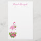 Papel de carta com um flamingo de Natal tropical vestindo um chapéu santa rosa. Debaixo dos pés está um buquê doce de cana com flores tropicais bonito e amoras rosa. Um punho de Holly no peito.